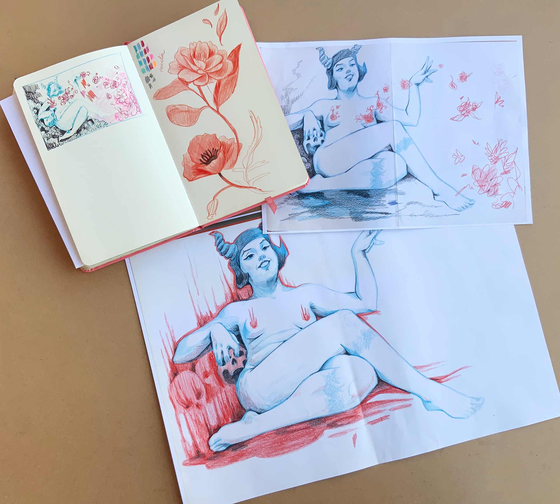 Bocetos, y pruebas sobre fotocopias a color del dibujo solo a azul.